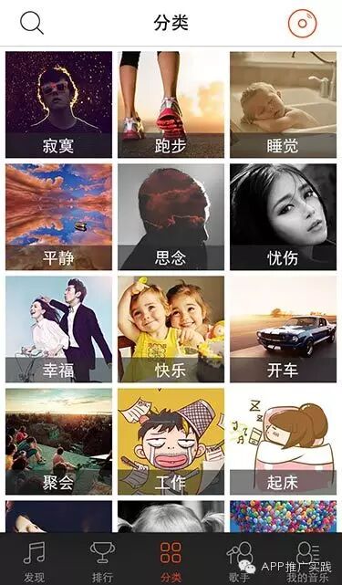 ③ “分类”当中按照心情、场合等将音乐进行细分,满足不同喜好的用户,每个板块里面的歌曲不多,但是会定期更新,呈现了一个类似于精选集的功能。