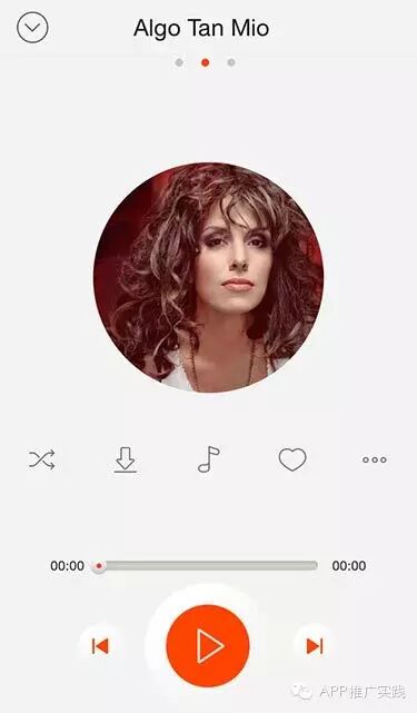 播放界面以浅灰色作为底色,主要的操作按钮以橙红色为主调,平铺在页面下方,摆脱了一般播放器的厚重感,整个界面显得比较完整,没有强烈的分割感,音乐封面以圆形包裹,但上方留白比较多,产生一种空荡感,在歌名下方增加歌手名应该会好一些,应该会通过左右滑动手势可以切换为播放列表和歌词界面,操作也很方便。