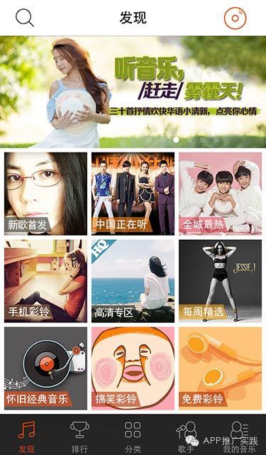 这款APP,图标乍一看有点眼熟哈,果断这事儿不能细想。进入程序,主界面被纵向分为两个区域,下方是功能区,上方是内容区,采用了比较怀旧的底部Tab栏,入口清晰,内容区块状分割,最大板块为精选集轮换,下方为风格分类。功能区包括“发现”、“排行”、“分类”、“歌手”和“我的音乐“,界面直观清爽,在分类功能中同样采用了重复块状UI结构,稍显乏味。