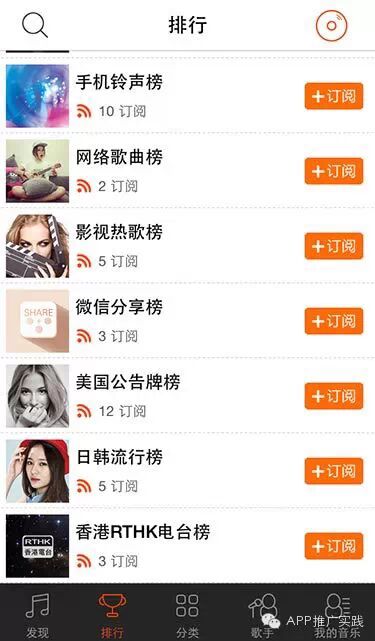 ② “排行”当中囊括了热门的音乐排行榜,包括美国Billborad榜单、香港RTHK电台榜等权威榜单,也包括日韩流行榜、手机铃声榜等民间榜单,不论你是要大气上档次,还是小清新接地气,都能够满足。