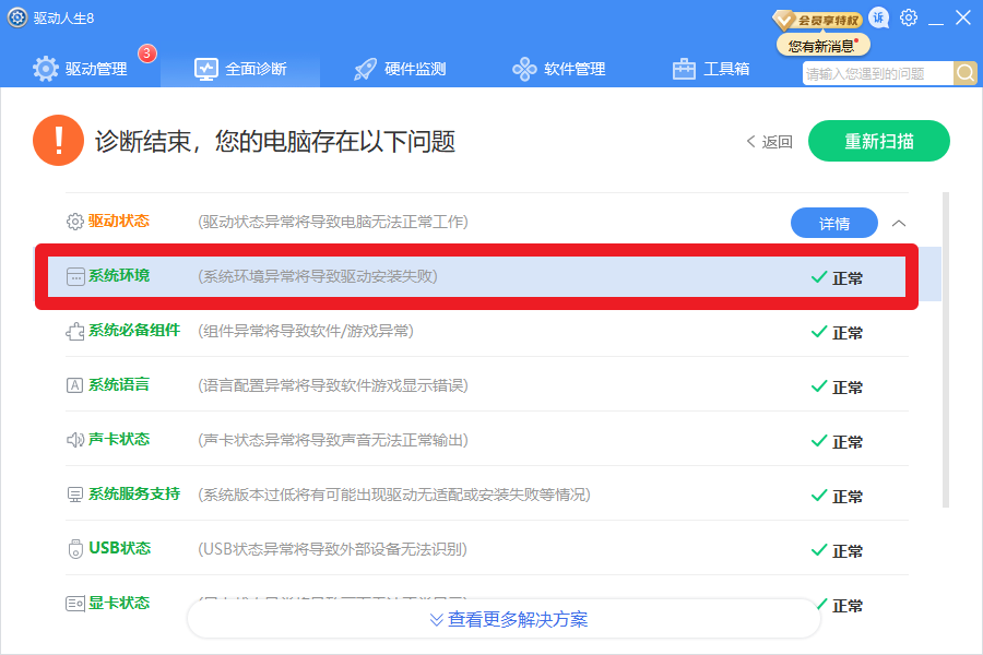 看驱动人生8【全面诊断】上的【系统环境】检查结果。