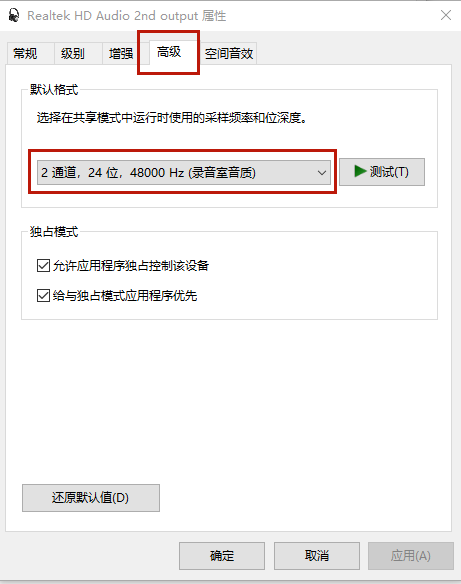 4、点击"高级"选项卡。在默认格式下,将下拉菜单改为24位,48000Hz(录音室质量)。