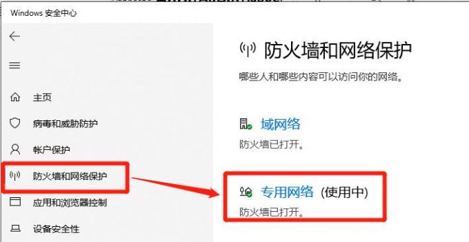 第四步:在【Windows安全中心】中,点击【防火墙和网络保护】,再点击进入【专用网络】页面。