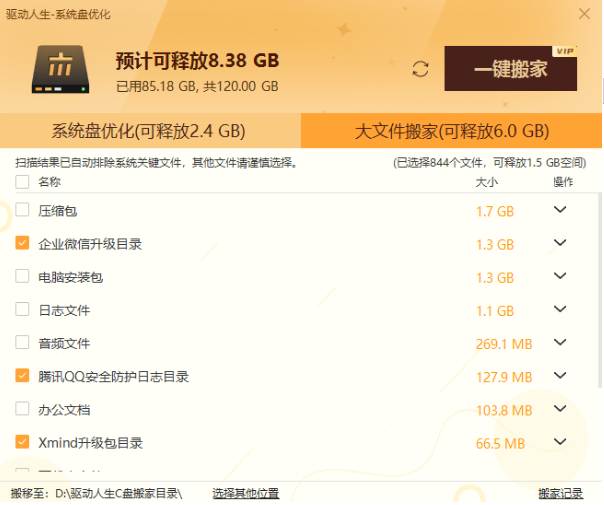 步骤三:C盘清理工具中有两大类核心功能,一是系统盘优化,已为用户区分好了哪些是可清理的文件。二是大文件搬家,可以根据打包好的文件分类,将文件转移到其他系统盘中,为C盘腾出空间。上述两种功能,都能有效的解决C盘内存不足的问题,用户按需选择即可,