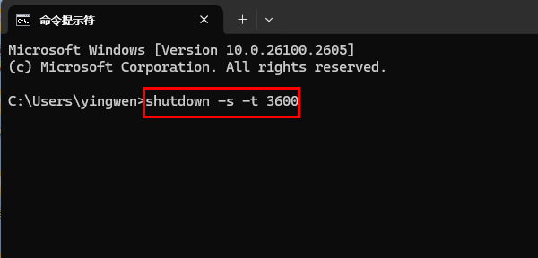 输入定时关机命令:在命令提示符中输入【shutdown -s -t 时间(以秒为单位) 】。例如,如果想让电脑在1小时后关机,可以输入【shutdown -s -t 3600】