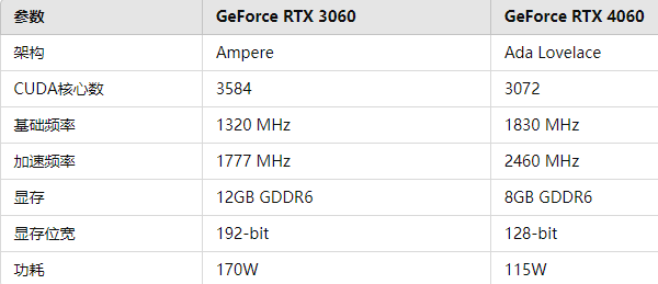 从表中可以看到,虽然4060的CUDA核心数量少于3060,但其核心频率显著提升,搭配最新架构优化后,整体性能表现反而更强。同时,4060的功耗降低至115W,这对于追求能效比的用户来说无疑是一个亮点。